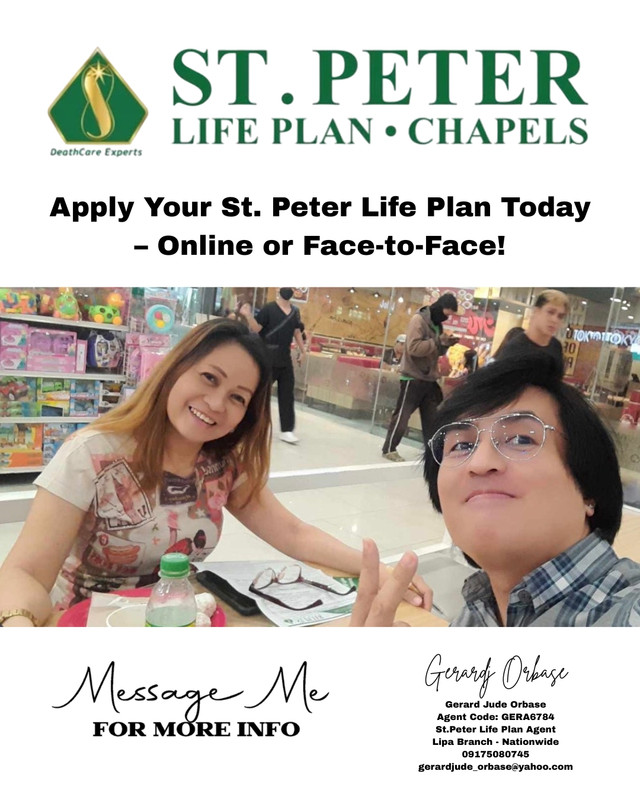 St. Peter eStore is the first and only full-service pre-need eCommerce platform in the Philippines. It allows you to buy a St. Peter Life Plan online, pay your premiums, and request for plan documents. Availing St. Peter Life Plan online is indeed easy and convenient! You can: 1. Apply from the comfort of your home 2. Get instant quotes and plan details 3. Make online payments 4. Access your plan details anytime This convenience saves time and effort, making it accessible to more people. No more paperwork or collector visits! Contact me to learn more and experience the convenience. Share with friends and relatives! KNOW THE DETAILS OF ST. PETER LIFE PLAN'S MEMORIAL PACKAGE! As a St. Peter Life Plan agent, I'm excited to share with you the benefits of having a St. Peter Life Plan in your family. FREQUENTLY ASKED QUESTIONS: Q: How can I buy a St. Peter Life Plan online? A: Simply visit our website, fill out the online application form, and pay your premium....